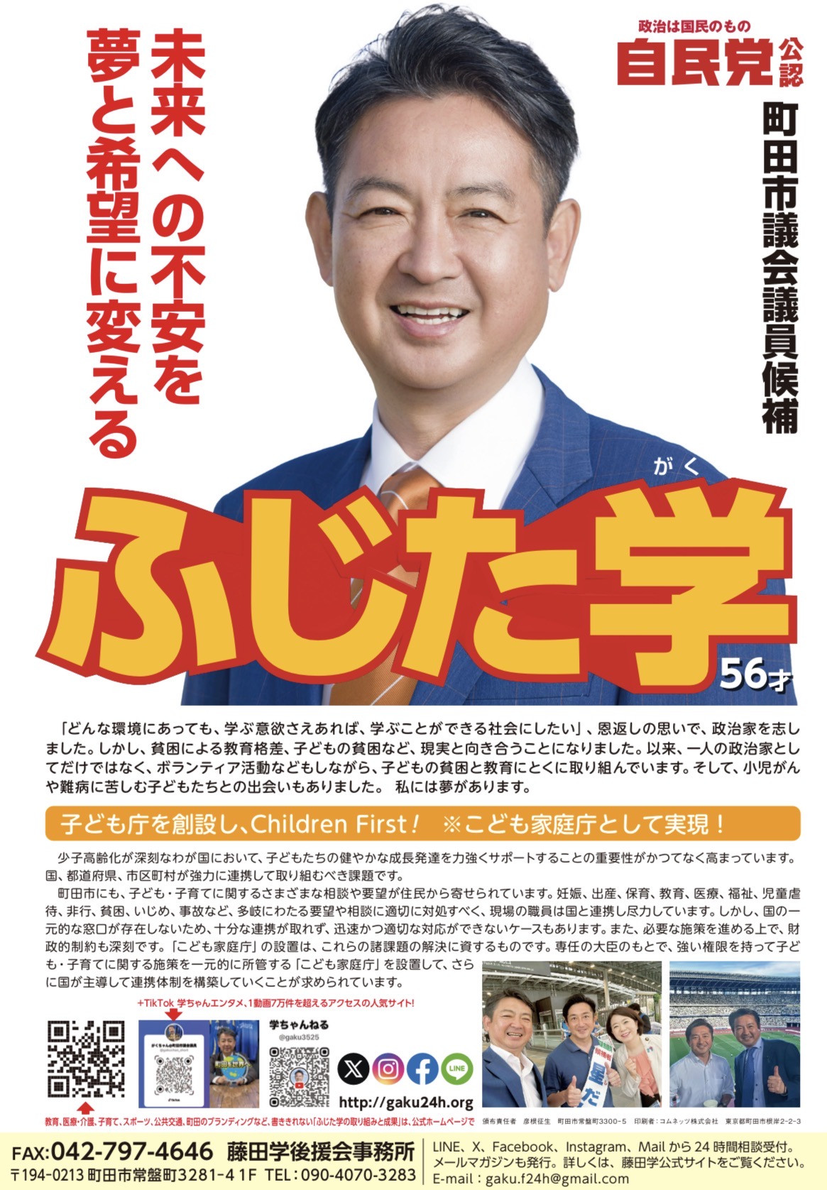 青森県弘前市に生まれ、高校卒業後上京、新聞配達や学校での仕事、奨学金をもらいながら、桜美林大学、大学院に通いました。その後、代議士秘書などを経て、当時は、地盤、看板、カバン(お金)なし、藤田学28歳、選挙事務所も自分のアパート。小さな選挙カーには自分の乗れるスペースがなく、車の後ろを自転車で走り、当時は泡沫候補と言われる中で、初当選することができました。奇跡を与えて下さった市民の皆さんへの感謝の思いはずっと持ち続けています。