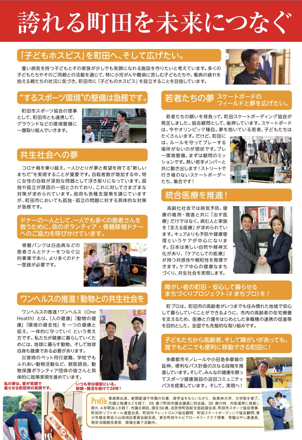 そして、市議を2期務め、36歳の時に市長選挙に立ち、惨敗。4年間の浪人生活を経て、町田市議会議員に復帰。現在6期目となります。気づけばもう56歳。現在は、自由民主党町田総支部政務調査会長、町田市スポーツ協会理事、町田市ソフトボール連盟会長、町田市マレットゴルフ協会顧問、町田スケートボーディング協会顧問、町田市青少年健全育成小山田地区委員会副会長、東京町田サルビアロータリークラブパスト会長など、初心を忘れずとの思いで、現場主義で活動しています。